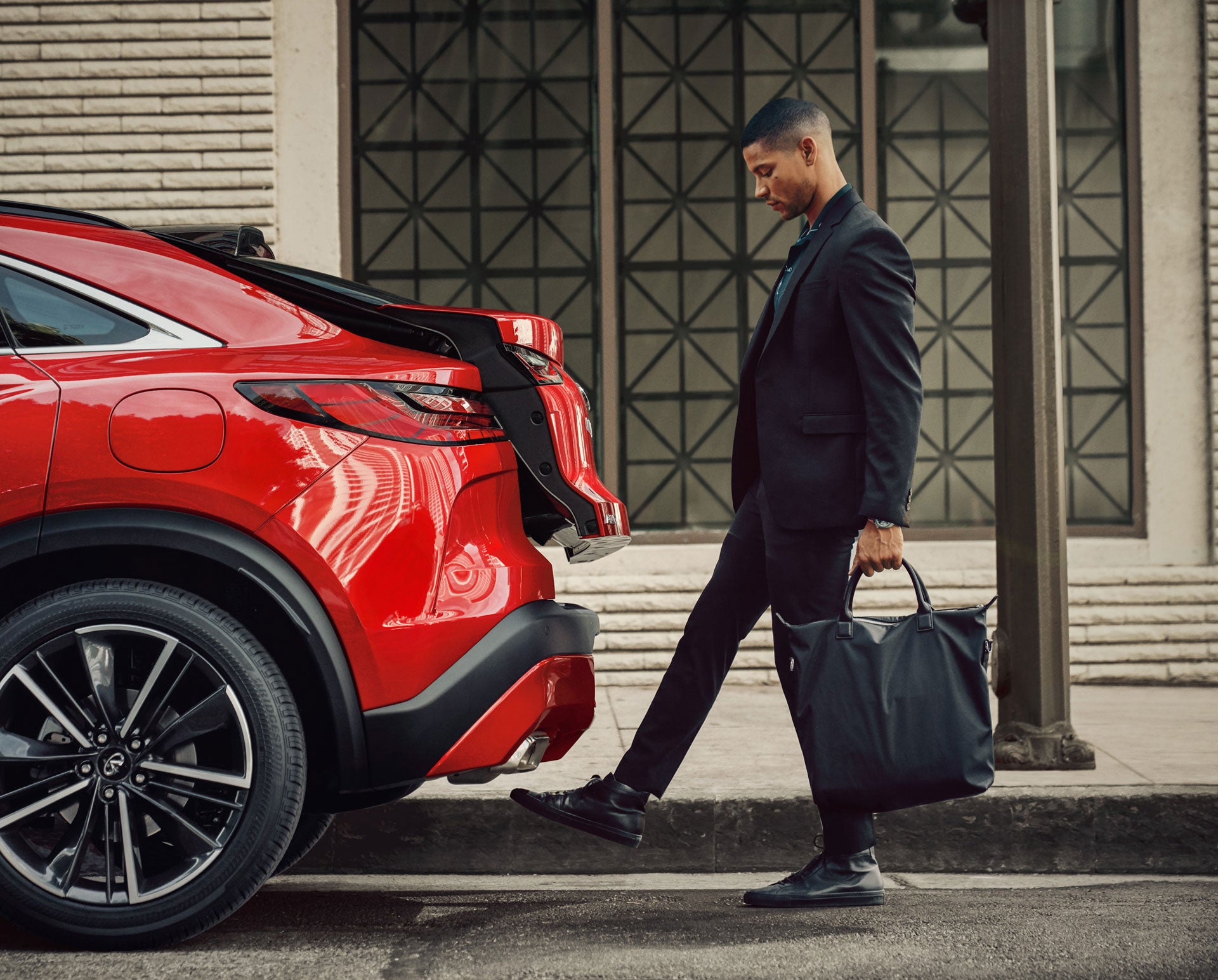 A touch of QX55’s badge-integrated liftgate latch reveals ample rear cargo space supported further by robust underfloor storage and conveniently sliding rear-row seats.[*]